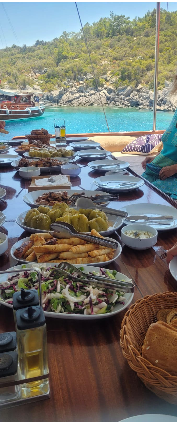 W ofercie pełne wyżywienie,woda, kawa, herbata, owoce, słone przekąski. Trzy posiłki dziennie - śniadanie, oboad kolacja. Dania kuchni tureckiej, greckiej. warzywa, mięso, owoce morze. Nasz pokładowy kucharz wyczaruje dla nas ryby owoce morza, mięso, warzywa- każdy znajdzie coś dla siebie.