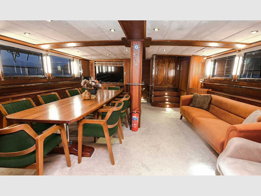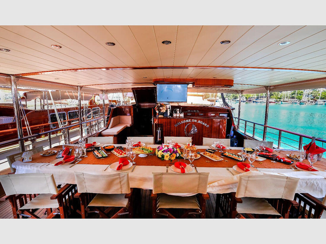 🍽️ Wyśmienita kuchnia na pokładzie — świeże owoce morza, tureckie meze, aromatyczne potrawy przygotowywane przez prywatnego kucharza.