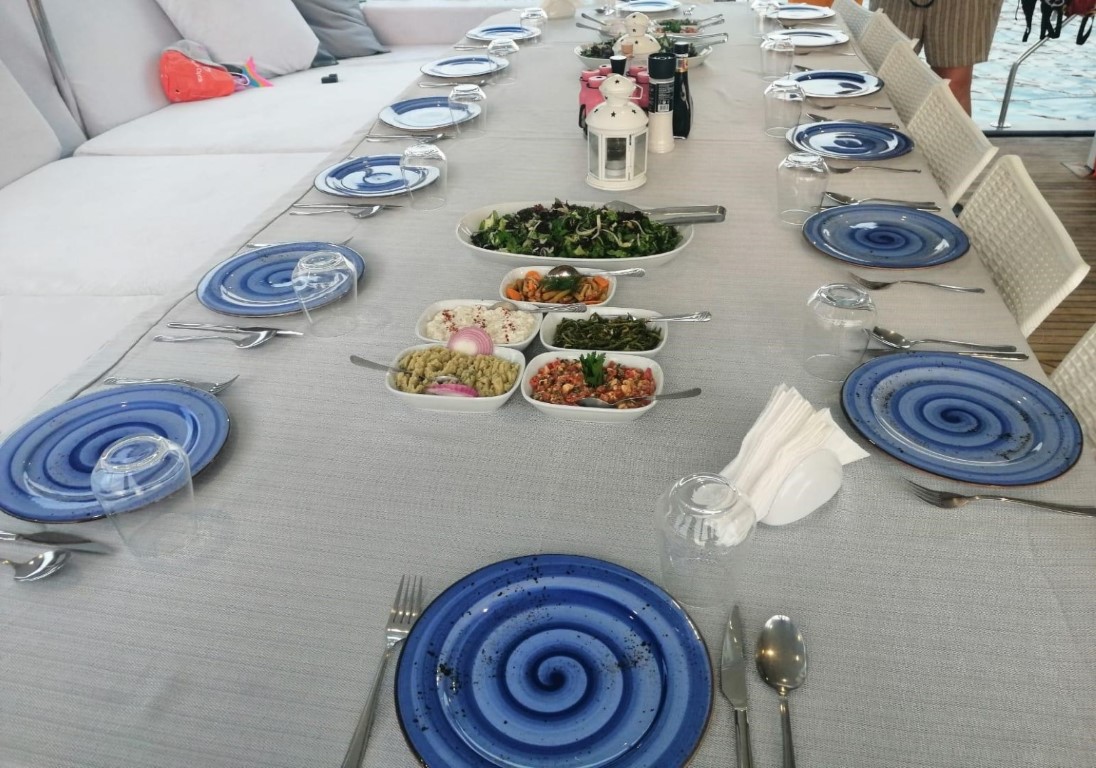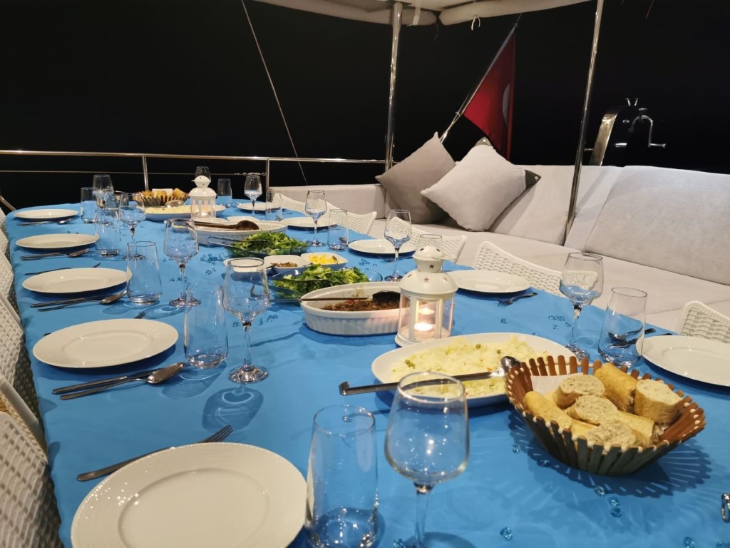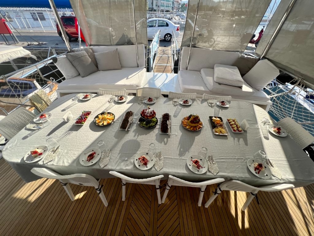 W ofercie pełne wyżywienie, woda ,kawa, herbata, owoce.. Trzy posiłki dziennie - śniadanie, oboad kolacja. Dania kuchni tureckiej, greckiej. warzywa, mięso, owoce morze. Nasz pokładowy kucharz wyczaruje dla Was ryby owoce morza, mięso, warzywa- każdy znajdzie coś dla siebie.